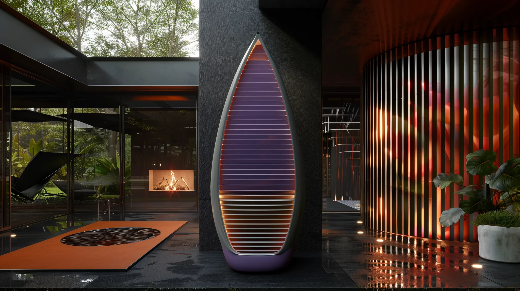 Ezek az elemek szoborszerű burkolatokként működnek: nemcsak takarnak, hanem karaktert adnak az adott térnek. A technikai szükségszerűség így építészeti jelenlétté és vizuális értékké alakul át.
